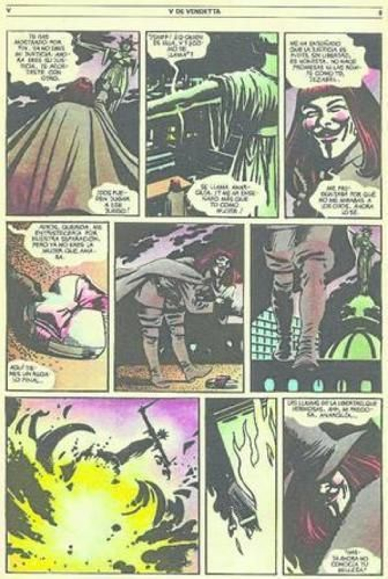La acción arranca en un futuro (ya pasado) 5 de noviembre de 1997. El gobierno de Inglaterra está en manos de un líder fascista, un Gran Hermano paternal y desaprensivo, que controla la población gracias a una tupida red de cámaras y a un férreo cuerpo policial (Poco se sabe del resto del mundo, quizás aniquilado en una hecatombe atómica). Ese 5 de noviembre, un enmascarado cumple el sueño no realizado de Guy Fawkes y reduce a escombros el Parlamento. El aparato de propaganda gubernamental, con extrema prontitud, convierte el atentado en una "demolición controlada" del edificio, realizada a altas horas de la noche para ahorrar molestias a la ciudadanía. Una a cero a favor del orden vigente, aunque esté no cantará victoria durante mucho tiempo. Acto seguido, el enmascarado acaba con varias figuras pertenecientes a la élite nacional. En la acción justiciera de V -que cita sin petulancia a Shakespeare o William Blake- despuntan vagos motivos personales, prontamente ensombrecidos por un plan de mayor calado. No se trata de saciar la propia sed, sino la de un pueblo. Ni de eliminar a unos cuantos canallas, sino de erradicar una ideología.