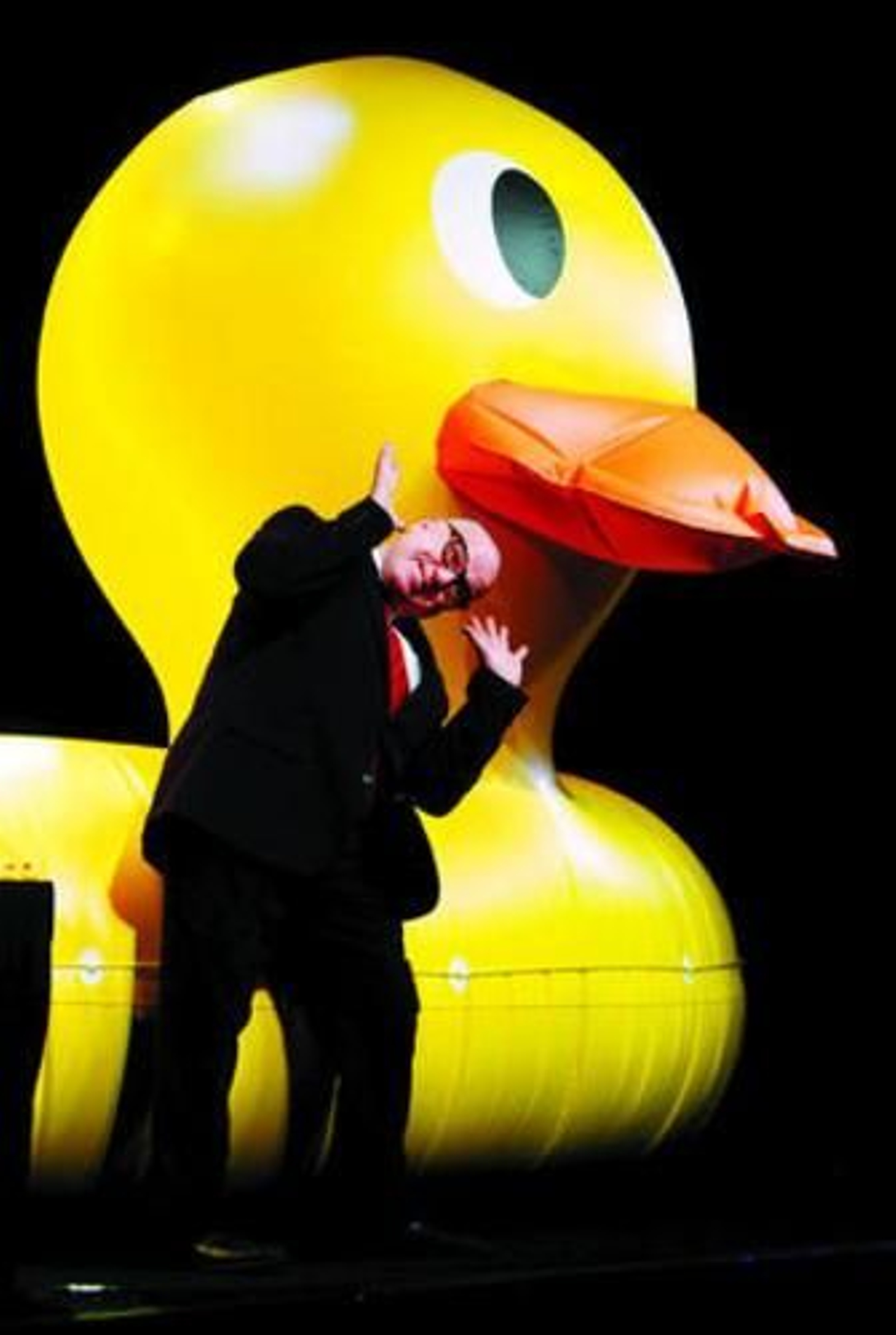 El patito de goma, ese que "no se hunde nunca, es indestructible y eternamente simpático y es la imagen menos agresiva que imaginar se pueda" es el nuevo aliado escénico de Leo Bassi, que, así, reiteró el crucifijo que simbolizaba su anterior montaje y que tantos problemas le trajo.