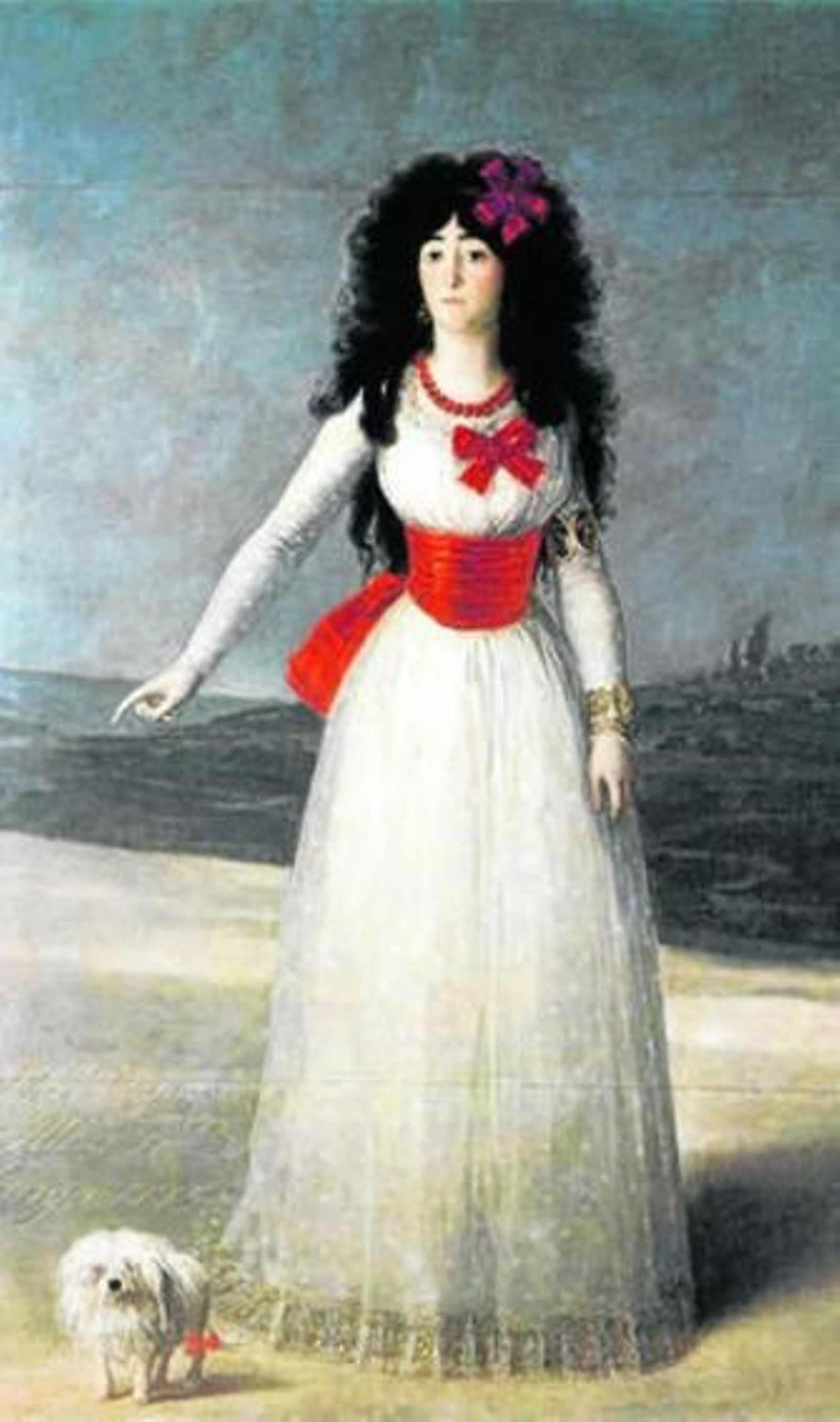 Volviendo a nuestra bella duquesa, la Casa de Alba conserva en el Palacio de Liria, el espléndido retrato que le hizo Goya en 1795. La gran dama se presenta de cuerpo entero luciendo su espectacular melena negra junto a un atuendo a la última moda compuesto por un vaporoso vestido blanco con una ancha faja roja bajo el pecho, color que también aparece en la moña que luce en la cabeza, el lazo sobre el pecho y el que lleva el perrito en una pata. La última duquesa de Alba ha hecho guiños a su antepasada luciendo en algunas ocasiones una moña en la cabeza. El otro famosísimo retrato que le realizó Goya se conserva en la Hispanic Society de Nueva York. Fue pintado en 1797 apareciendo la duquesa vestida de maja con mantilla negra señalando con un dedo al suelo donde se lee claramente: "Solo Goya". Estas dos palabras han hecho correr ríos de tinta sobre los supuestos amoríos entre ellos. En definitiva, aunque doña Cayetana no posara desnuda para Goya, fue una mujer de leyenda por su belleza, títulos, posesiones y marcada personalidad.