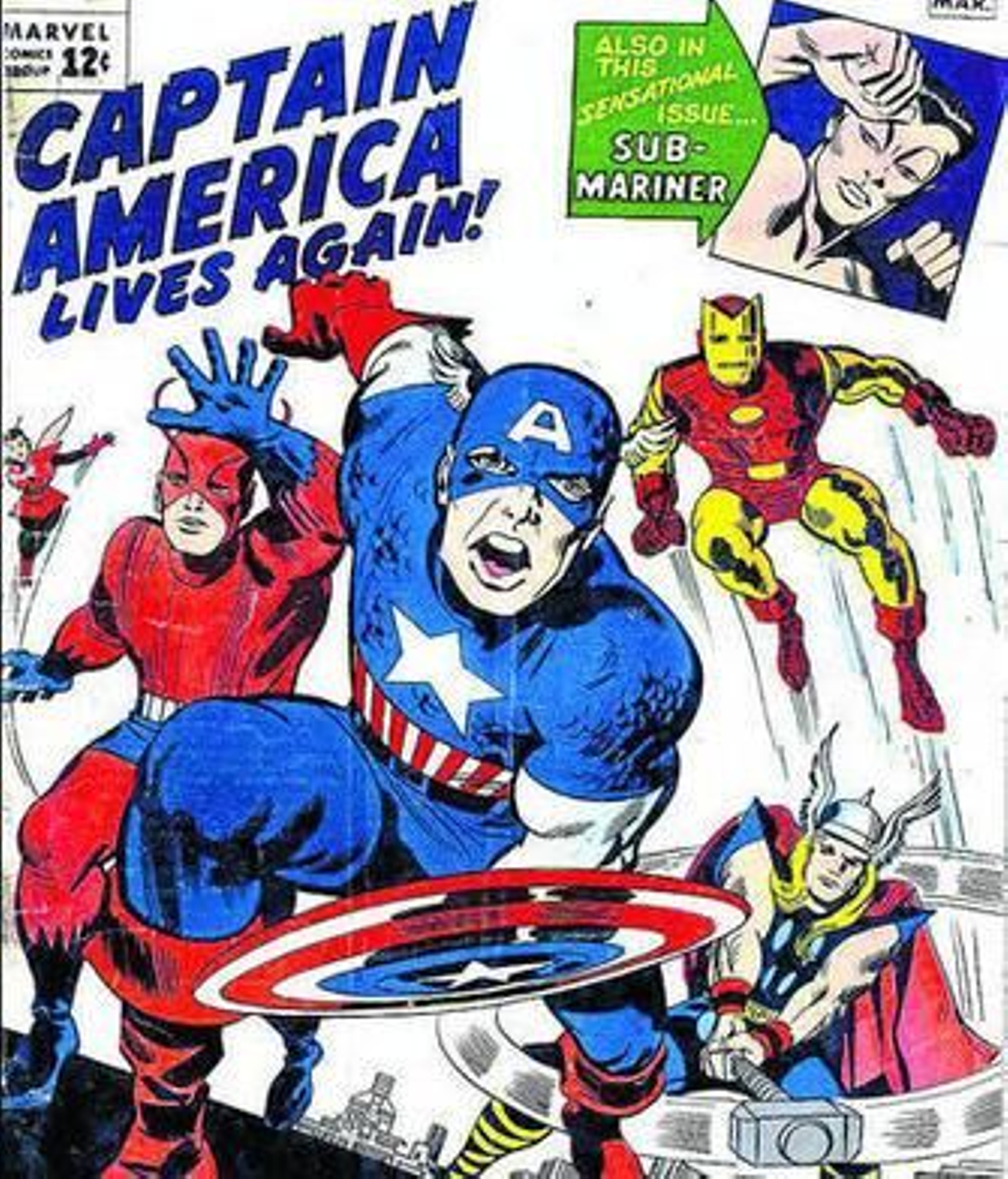 Para que los superhéroes volvieran a levantar vuelo hubo que reformar el discurso, y ahí Marvel se llevó la palma, ya en la década de los 60. Un Stan Lee en estado de gracia, sentado en la creatividad del propio Kirby, Steve Ditko y compañía, se inventó en apenas un lustro el universo Marvel, y tuvo entre sus aciertos la recuperación de algunos iconos de décadas anteriores, entre ellos el Capitán América. Tan señalado evento tuvo lugar en las páginas del inolvidable Avengers 4 (marzo, 1964), en el que el Capi es literalmente descongelado. El feliz retorno ya había sido anunciado en las páginas del Strange Tales 114 (noviembre, 1963), allí la Antorcha Humana se enfrenta a un acróbata ladrón que anda disfrazado de Capitán América, pero fueron Los Vengadores los elegidos para rescatar definitivamente del olvido al héroe. Unos meses más tarde, a finales de 1964, el Capi irrumpía en Tales of Suspense, donde compartió cartel con Iron Man en una cuarentena de tebeos dinámicos y prodigiosos, casi todos dibujados por Kirby. El nuevo Capitán América resultó ser el antiguo, que había estado hibernando desde los tiempos de la Segunda Guerra Mundial, y es así que Lee y Kirby convirtieron las décadas de ausencia del personaje en uno de los motores de la serie. Claro que con el superhéroe regresó también su némesis, el Cráneo Rojo, y también llegaron una cohorte de villanos de nuevo cuño: el Superadaptoide, Batroc, I.M.A, Modok, el barón Zemo, para deleite de los lectores.