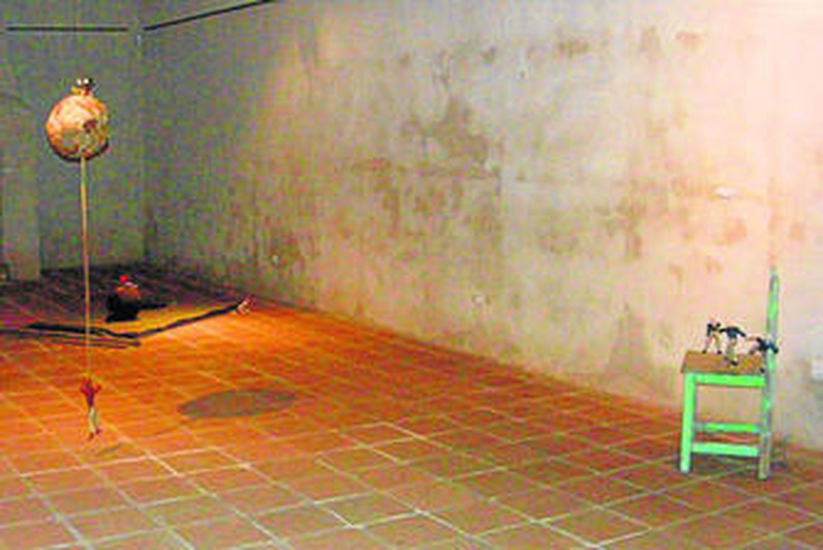 Las piezas escultóricas que ocupan la sala posterior, dotadas con una iluminación que acentúa el recogimiento y lo escenográfico, convierten el espacio en una suerte de teatro de las emociones. Lumbreras ha ido incorporando a sus esculturas objetos desclasados y materiales pobres, lo que maximiza el sentido expresivo y la metafórica fragilidad y futilidad de los seres mínimos que pueblan sus conjuntos escultóricos. Nuevamente, éstos giran sobre la angustia y el peligro, entre otros sentimientos. En varias de las esculturas se recupera una figura recurrente del artista en su obra desde hace más de una década: sus bolas, tal vez como globos terráqueos, sobre las que se sitúan dominantes ratas y ratones Mickey, con toda la carga ambigua que atesoran de falsa ingenuidad y posible presencia de la muerte.