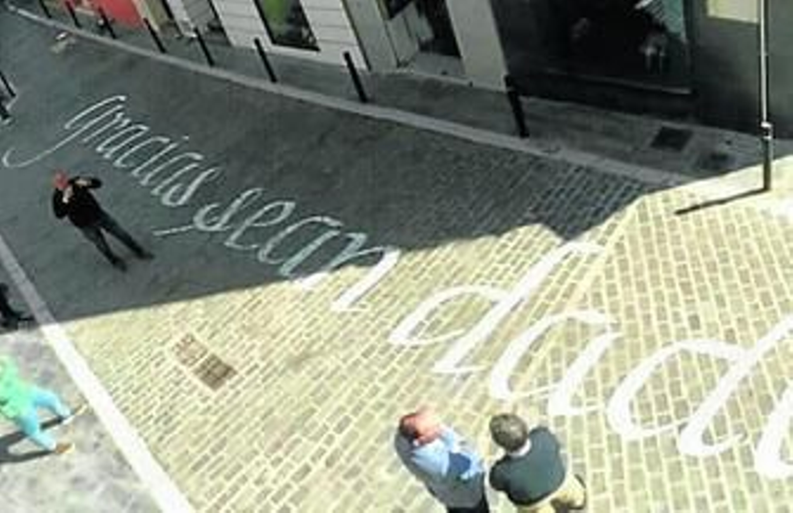 El artista realizó las letras gigantes de forma manuscrita y empleando la cancilleresca, una fuente propia del siglo XVI, y dedicó una jornada de trabajo a confeccionar la cita, pero con el paso de los días, las letras se han borrado parcialmente y hay tramos que se han vuelto ilegibles. El concejal de Cultura, José Alarcón, explicó que ante la expectación mediática que generó esta iniciativa y su buena acogida entre vecinos y comerciantes, se han producido numerosas llamadas al Ayuntamiento para alertar de esta situación.