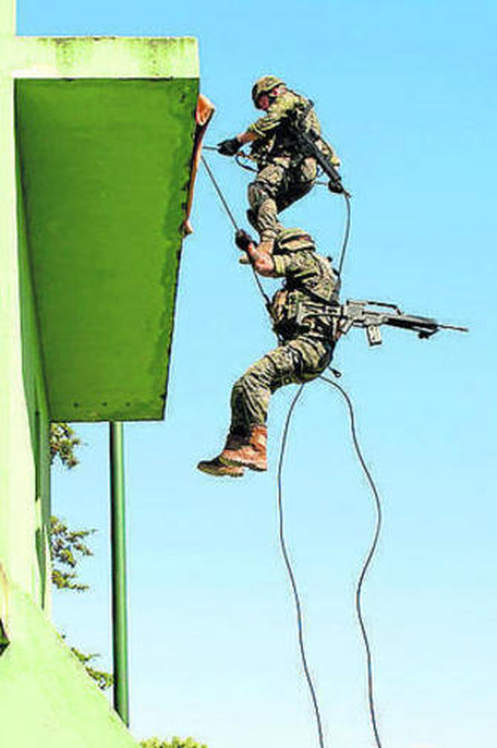 Por otra parte, también tuvieron la oportunidad de comprobar un entrenamiento de un equipo para descender por una maroma, rapelar desde el patín de un helicóptero o hacer lo mismo de la parte superior de una vivienda. De igual modo, otro equipo realizó un descenso a la portuguesa por una pared vertical, en el que uno de los legionarios bajó de frente y empuñando un arma para dar protección al resto de sus compañeros. Los visitantes tuvieron la oportunidad de acceder al interior del simulador de tiro, en el que efectuaron disparos sobre blancos sin necesidad de gastar munición.