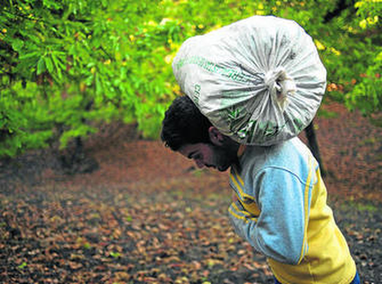 Un trabajo nada fácil, debido a las condiciones orográficas en las que se encuentran los castaños, que se están situados sobre las laderas, algunas de ellas de gran pendiente. Además, no siempre es posible acceder a los mismos mediante vehículos, por lo que tiene que procederse al transporte manual de los sacos de castañas que han sido llenados.
