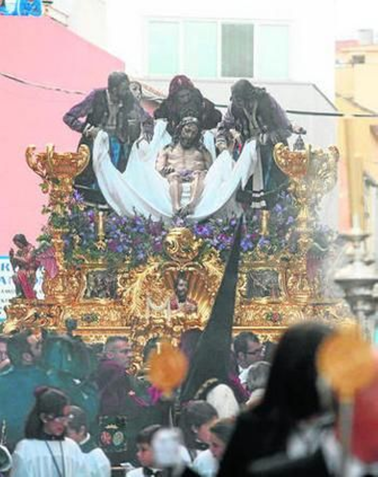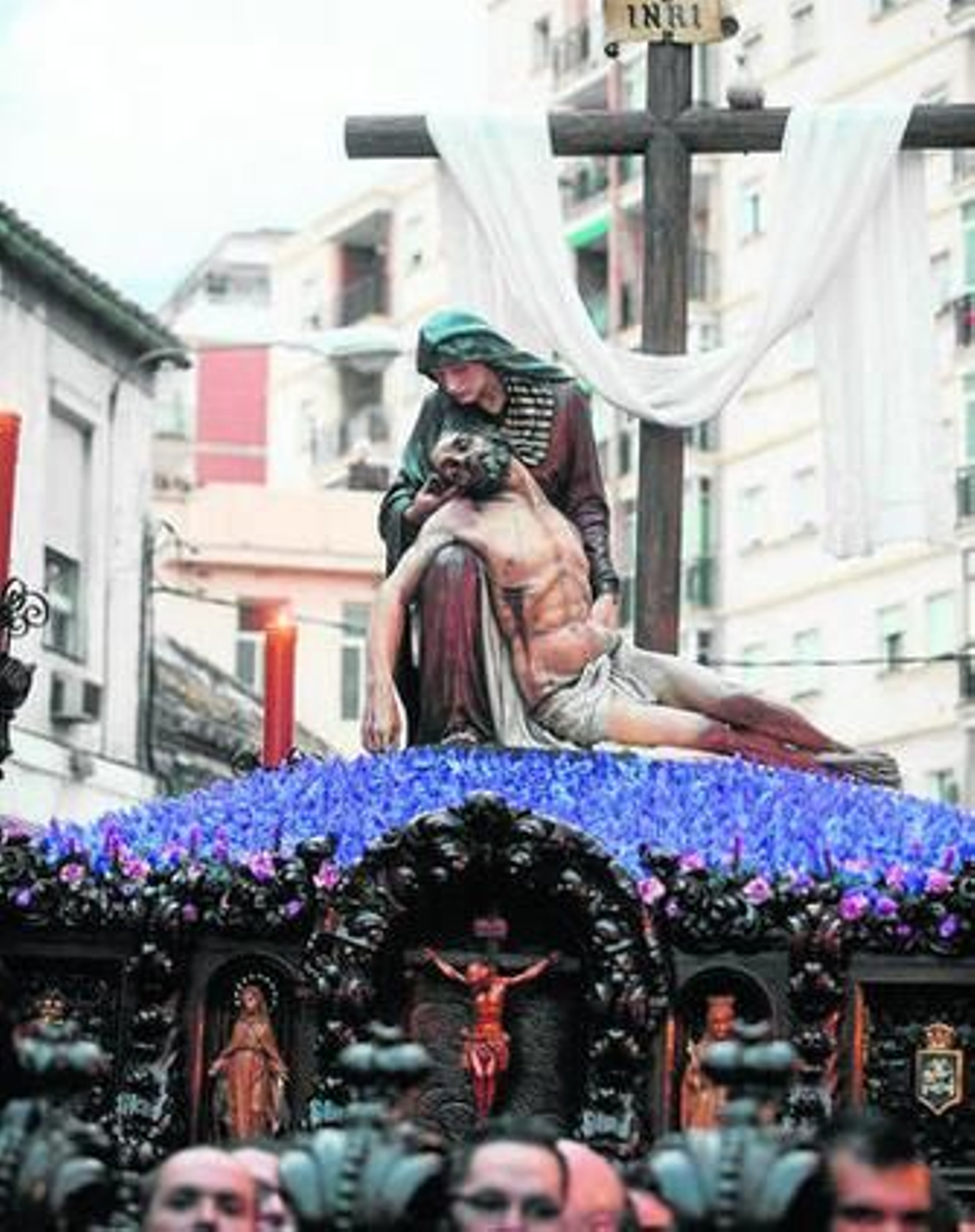 El imponente grupo escultórico de la Piedad es una luz en medio de un tenebrismo de un cortejo que no luce a la altura de las imágenes a las que acompañan. Pocos nazarenos y muy poco compactos hacen que la procesión no luzca con demasiado empaque. Es cierto que es raro ver a la Piedad sin llevar el paso con buen ritmo. En cuanto al exorno floral, el grupo escultórico de Palma Burgos lució su tradicional monte de lirios morados combinado con un friso de flores en tonos rosáceos que no aportaba y que encima le restaban prestancia al exorno. Aunque sigan siendo de parafina, es de agradecer que los hachones fueran de color oscuro y no blancos como el año pasado que deslucían aún más.