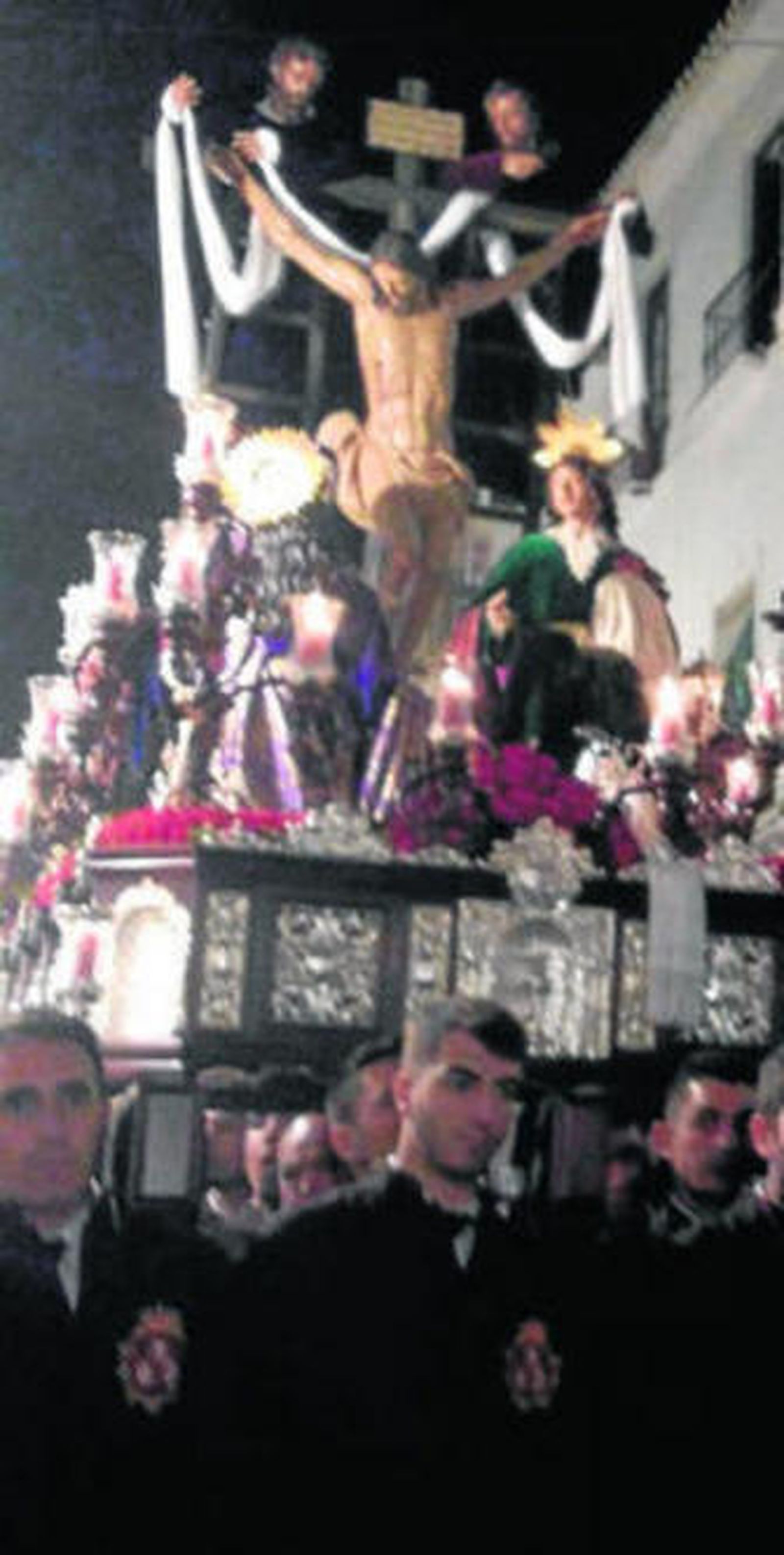 Muy cerquita, desde San Juan se ponía en marcha la Cofradía del Santísimo Cristo del Mar, María Santisima de las Penas, San Juan Evangelista y Santa María Magdalena. Estrenaba arco de campana donada por dos familias veleñas así como la túnica de San Juan en terciopelo verde. La luz que todavía reflejaba calle de Enmedio y la estrechez de la misma a los sones de su banda, la de tambores y cornetas del Cristo del Mar, hicieron una estampa para el recuerdo.