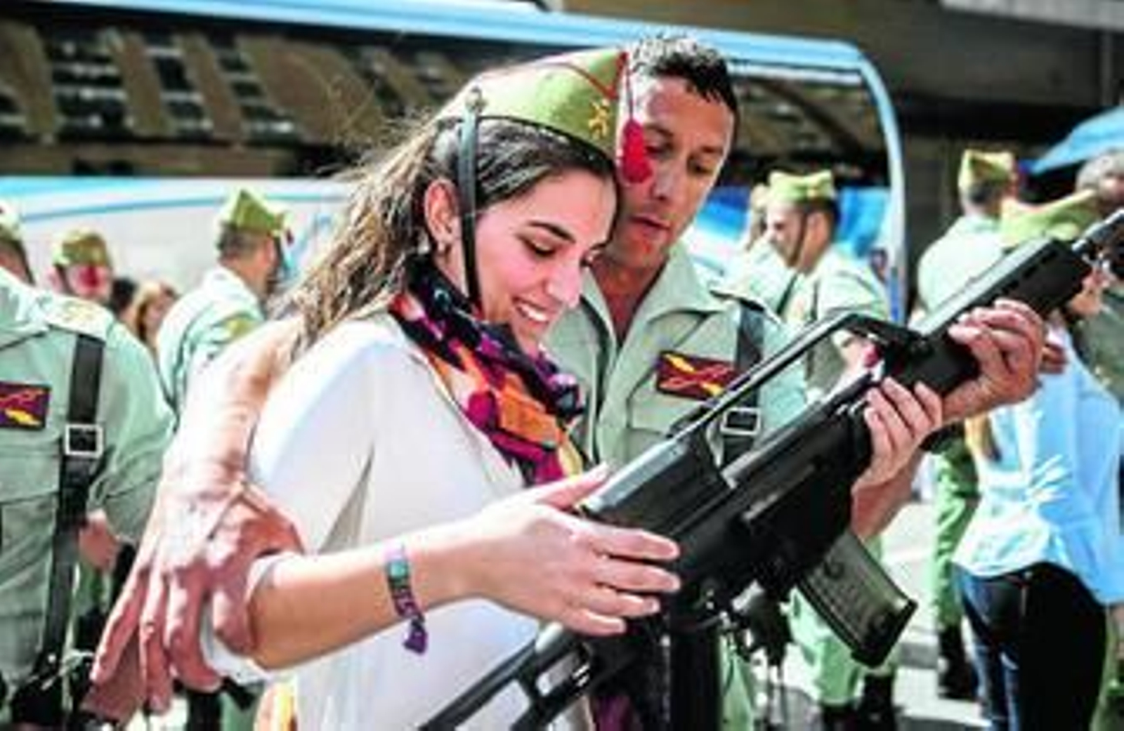Pero cuando de manera más proverbial se concreta este amor de Málaga a la Legión es al término del traslado en Santo Domingo. Entonces, cuando termina la liturgia, el rito se esfuma y sólo cabe esperar y montar guardia hasta la salida de la procesión, el telón cae y los héroes se revelan como hombres. En consecuencia, se dejan saludar, felicitar, abrazar y agasajar con muestras de cariño que en más de una ocasión rayan la incorrección política. Pero ellos, los caballeros legionarios, debidos a su pueblo, reciben a todos tirando a menudo de infinita paciencia; y así acceden a hacerse todo tipo de fotos y hasta a impartir fugaces lecciones sobre las maniobras con el fusil a encantadas discípulas. Aquí, al lado del río, la venta de insignias, escudos, llaveros, lacitos y todo el marketing se dispara y la mercancía, por lo general, se agota: para entonces, quienes se habían mostrado reservados ya no tienen dudas en la recámara. Junto al Puente de los Alemanes, alzado como un esqueleto sobre el cauce seco, las figuras maltrechas de los veteranos empiezan a diluirse como fantasmas de los que ya nadie recuerda: sus barbas ralas, sus ojos pequeños, las manos curtidas y las espaldas inclinadas, como para apurar las heces del último pitillo, encierran las briznas que quedan de las glorias añejas y del vago recuerdo. Son ellos, o deberían ser, los protagonistas de la jornada. Pero ya se sabe que las patrias no suelen ser buenas madres.