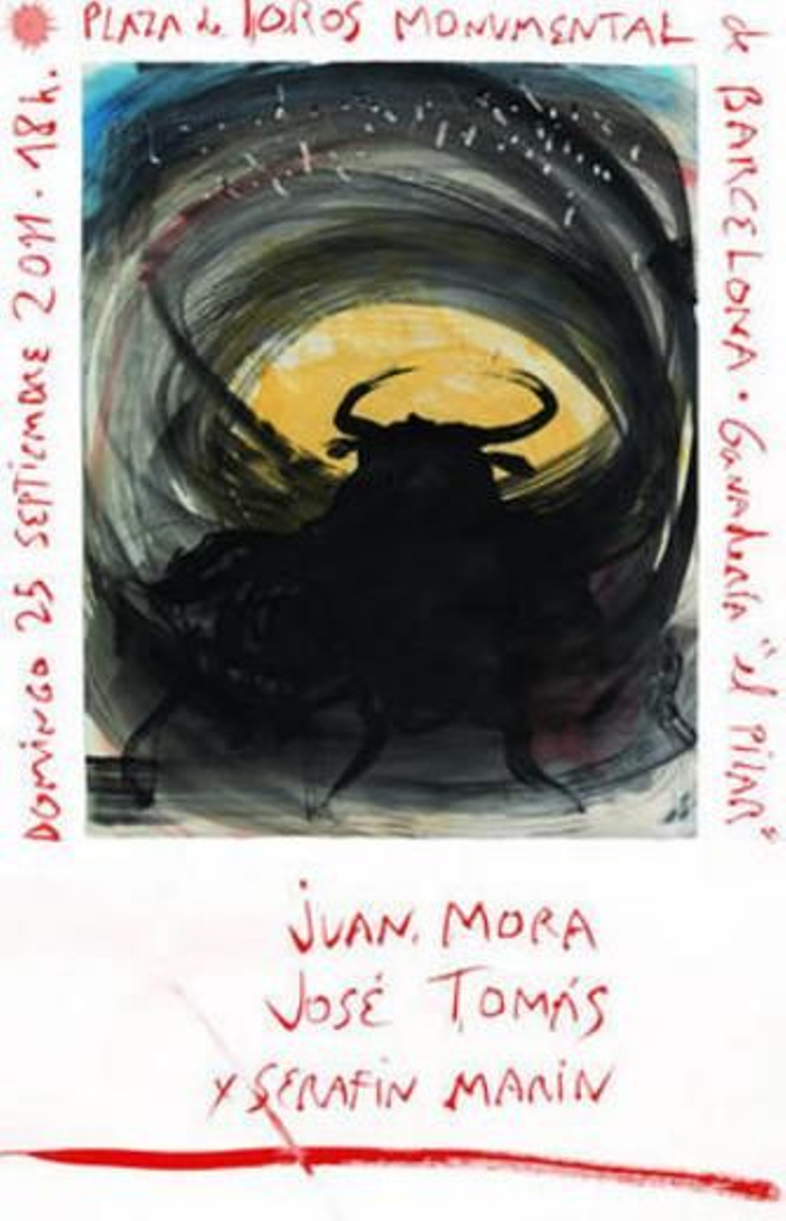 El pintor mallorquín Miquel Barceló ha pintado el cartel promocional de la última corrida de toros que tendrá lugar en la Monumental de Barcelona, antes de que entre en vigor la prohibición de las corridas en Cataluña, el 1 de enero de 2012. Barceló sitúa la figura del toro flotando sobre un trazo circular negro, en cuyo centro sobresale el color ocre de la arena, y en la parte inferior escribe en letras rojas los nombres de los diestros que intervendrán en el histórico festejo: José Tomás, Juan Mora y Serafín Marín. Asimismo queda reflejada la ganadería de El Pilar, el hierro salmantino al que pertenece el encierro que lidiará la citada terna. El cartel comenzará a pegarse el próximo lunes día 19. Barceló tiene otras obras sobre tauromaquia, como el cartel de la temporada 2008 en la Maestranza sevillana.